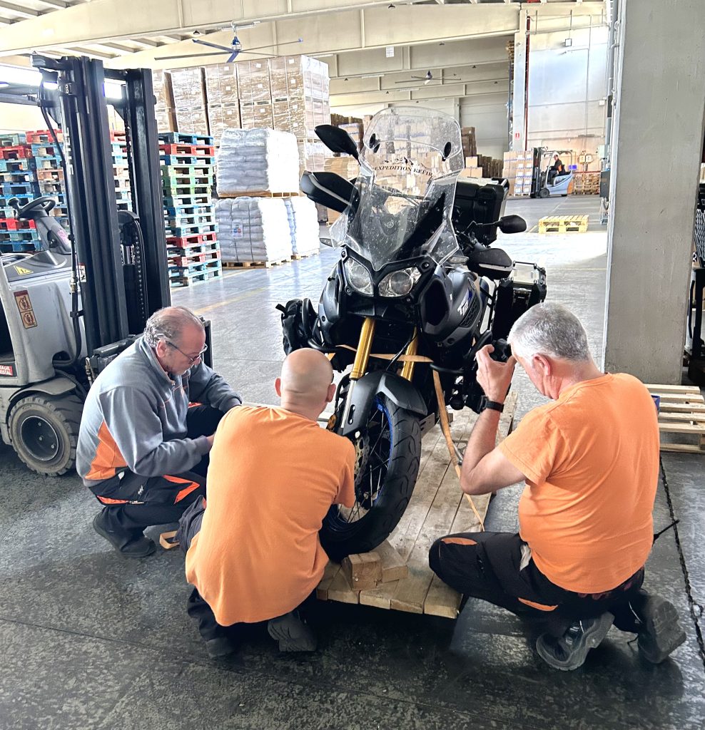 Taskerne kom på igen, og ved fælles hjælp fik vi fastspændt Yamaha’en. Inden længe stod den fikseret og klar til den 2.600 km lange rejse med Modultransport til Alicante.