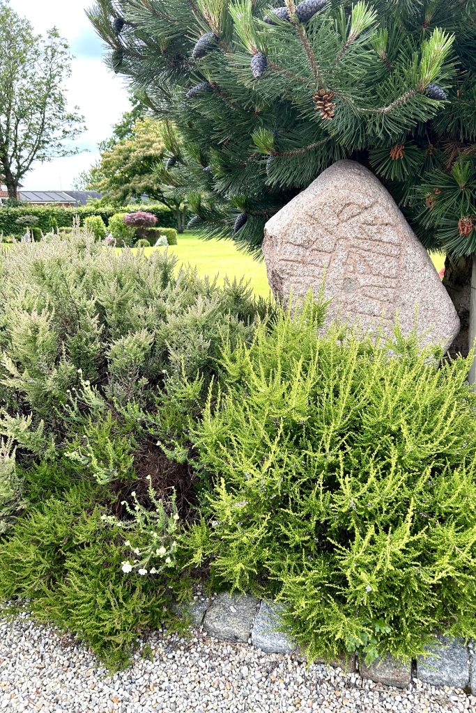 Runestenen i Horne står fint på kirkegården, og man har forsøgt at skærme og beskytte den ved at placere den under nogle små træer. Lad os håbe, at det er tilstrækkeligt.
