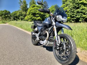 På vej ned ad tilkørslen til motorvejen kan jeg konstatere, at der er godt med saft og kraft til rådighed. Turen op gennem gearene går ubesværet, og Guzzi’en ligger klippefast på kursen. Det gør sig også gældende ved vognbaneskift med 130 km/t, og i det hele taget kan man godt mærke, at der er styr på stabiliteten.